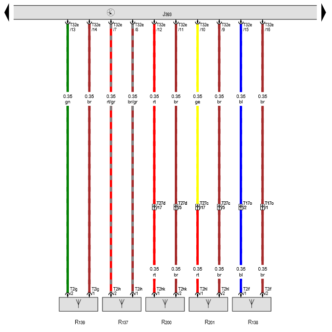 8 | Клемма 31, к 51 Точка подключения к массе в багажном отсеке справа | 8 | Передний правый датчик парковочного ассистента -G252- | 8 | "Масса" заднего датчика | ||